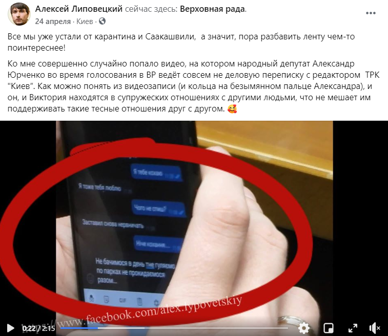 По декларации депутат женат и воспитывает сына. При этом в апреле журналист Алексей Липовецкий опубликовал видео, на котором нардеп ведет романтическую переписку явно не с супругой, которую зовут Олеся. На экране смартфора Юрченко общается с девушкой по имени Виктория, которой признается в любви.