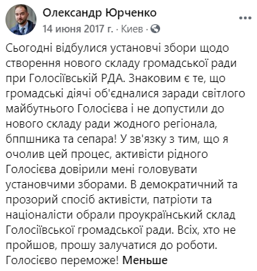 В 2014 году он принимал участие в местных выборах. И был членом Голосеевского избиркома от "Свободы". То есть Юрченко именно в этой националистической партии начинал свою постмайданную карьеру.
