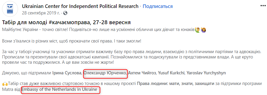 Уже будучи депутатом, в 2019 году, Юрченко вместе с коллегами из "ЕС" и "Голоса" поддержали оплаченный посольством Нидерландов "правозащитный лагерь для молодежи".