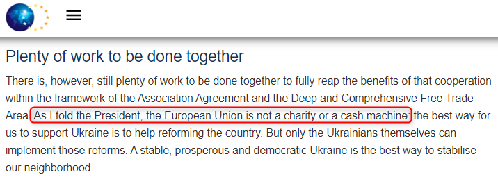 "Как я сказал президенту, Европейский Союз не благотворительная организация или банкомат. Лучший способ поддержать Украину для нас - это помочь в реформировании страны, но осуществить эти реформы могут только сами украинцы".