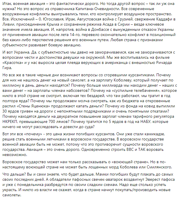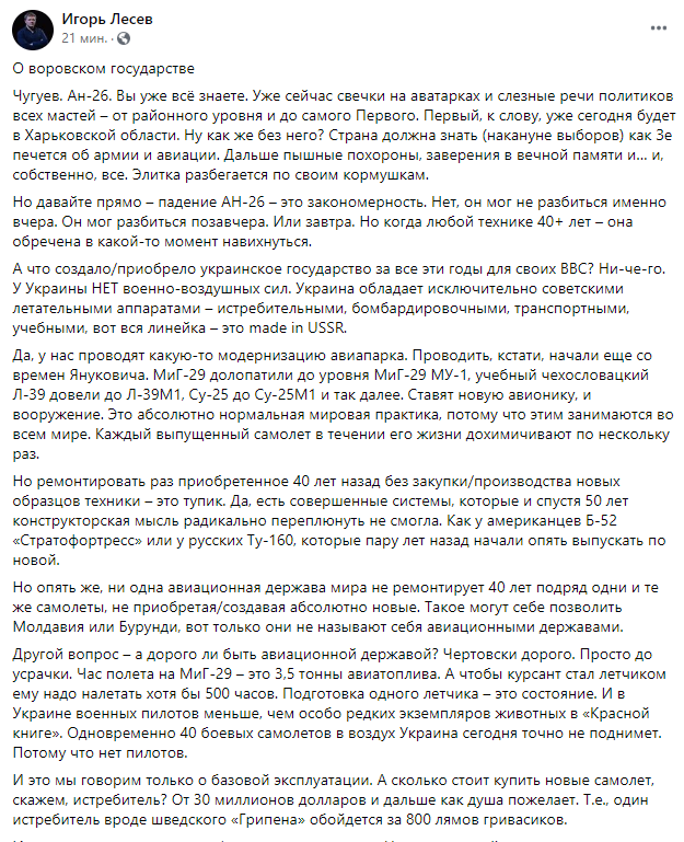 "Чугуев. Ан-26. Вы уже всё знаете. Уже сейчас свечки на аватарках и слезные речи политиков всех мастей – от районного уровня и до самого Первого. Первый, к слову, уже сегодня будет в Харьковской области. Ну как же без него? Страна должна знать (накануне выборов) как Зе печется об армии и авиации. Дальше пышные похороны, заверения в вечной памяти и… и, собственно, все. Элитка разбегается по своим кормушкам.