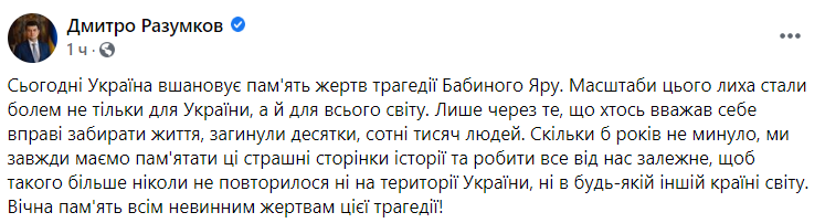 "Сегодня Украина чтит память жертв трагедии Бабьего Яра. Масштабы этого бедствия стали болью не только для Украины, но и для всего мира. Только потому, что кто-то считал себя вправе отнимать жизнь, погибли десятки, сотни тысяч людей. Сколько бы лет ни прошло, мы всегда должны помнить эти страшные страницы истории и делать все от нас зависящее, чтобы такого больше никогда не повторилось ни на территории Украины, ни в любой другой стране мира.