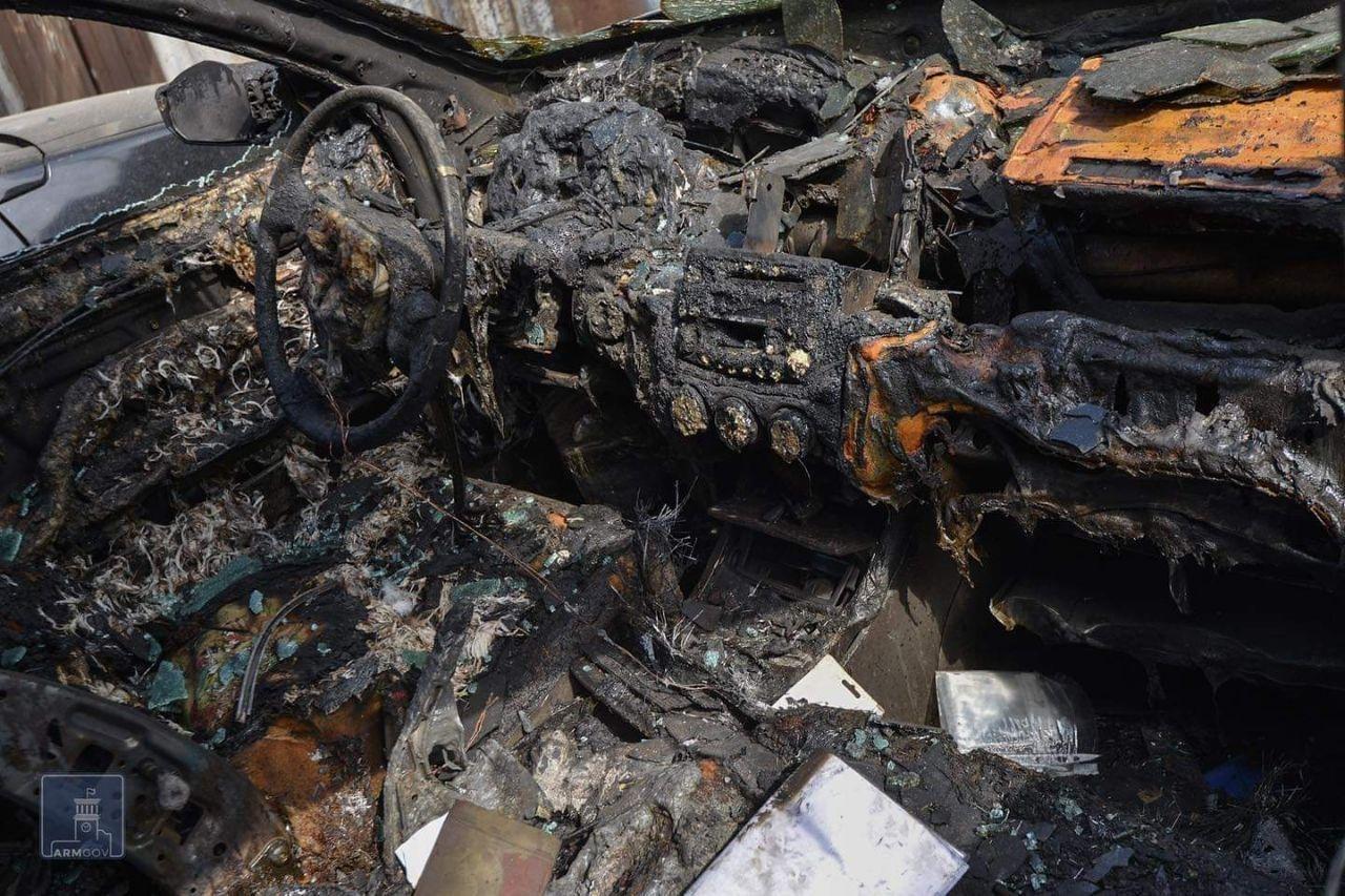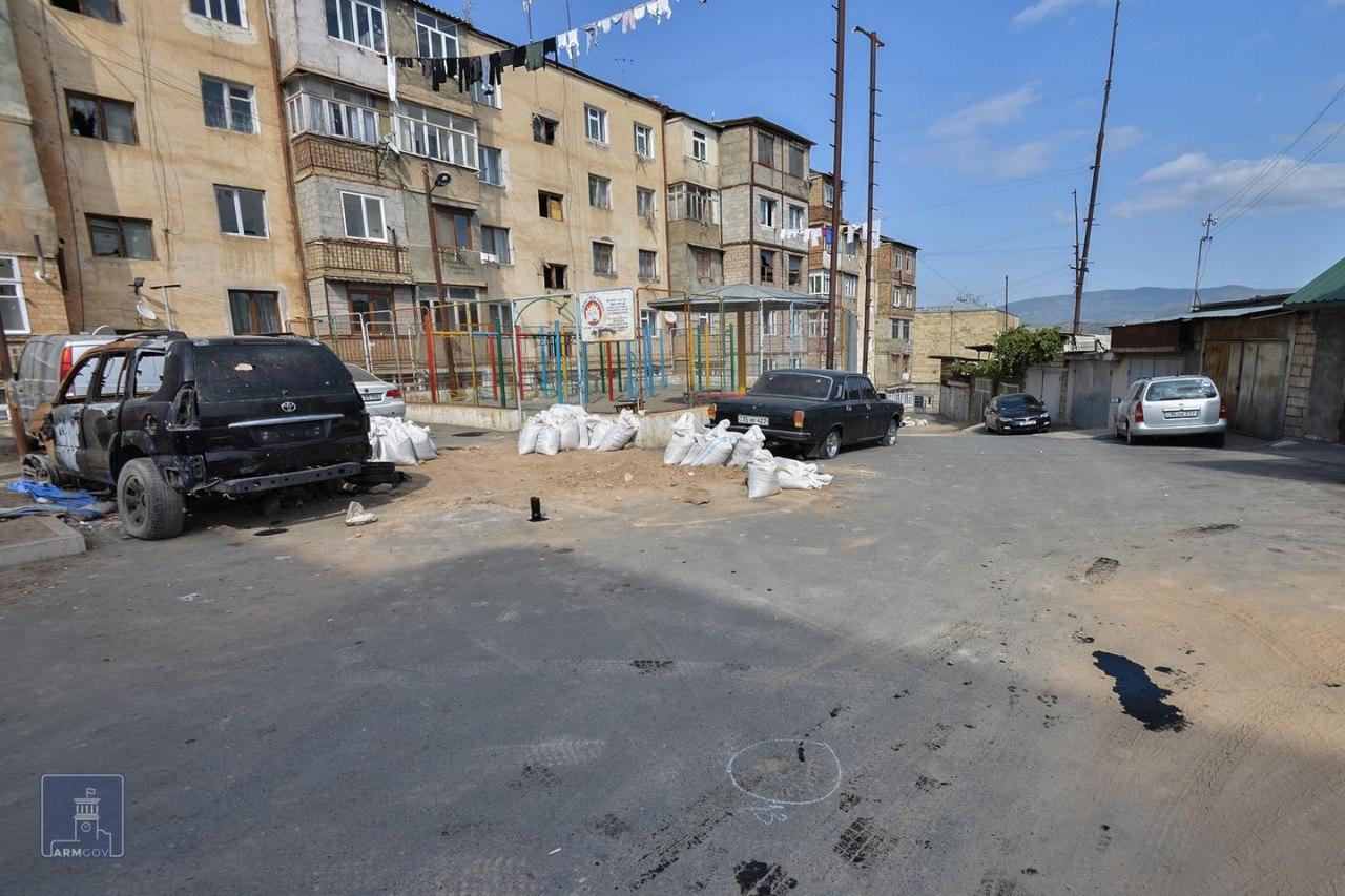 На фото видны опустевшие дворы столицы Нагорного Карабаха, поврежденные и сгоревшие автомобили, следы от пуль, а также мешки с песком, которые, очевидно, служили укрытием.