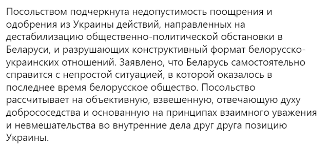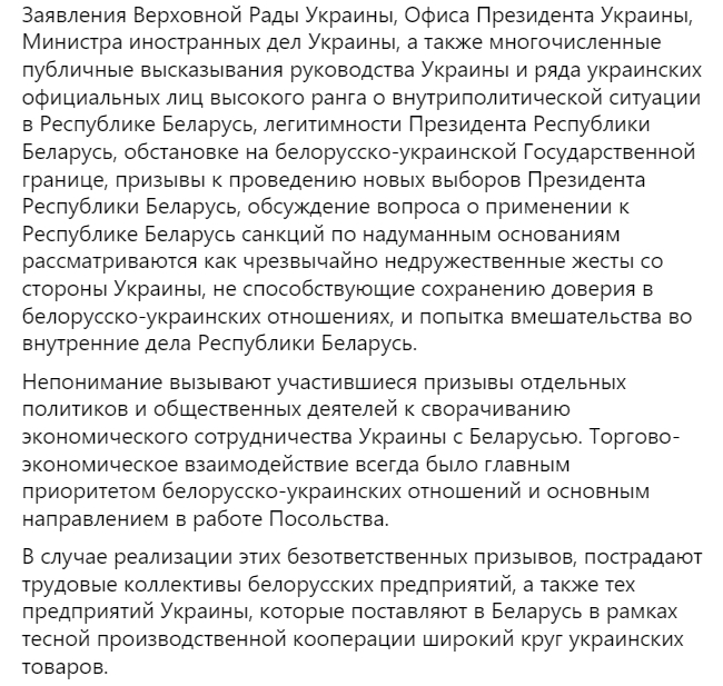 "Заявления Верховной Рады Украины, Офиса президента Украины, министра иностранных дел Украины, а также многочисленные публичные высказывания руководства Украины и ряда украинских официальных лиц высокого ранга о внутриполитической ситуации в Республике Беларусь, легитимности президента Республики Беларусь, обстановке на белорусско-украинской государственной границе, призывы к проведению новых выборов президента Республики Беларусь, обсуждение вопроса о применении к Республике Беларусь санкций по надуманным основаниям рассматриваются как чрезвычайно недружественные жесты со стороны Украины, не способствующие сохранению доверия в белорусско-украинских отношениях, и попытка вмешательства во внутренние дела Республики Беларусь", - сказано в сообщении.