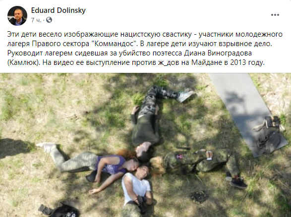"Эти дети, весело изображающие нацистскую свастику, участники молодежного лагеря "Правого сектора" "Коммандос". В лагере дети изучают взрывное дело. Руководит лагерем сидевшая за убийство поэтесса Диана Виноградова (Камлюк). На видео ее выступление против ж@дов на Майдане в 2013 году", - написал Долинский.