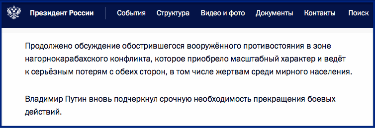 В Кремле указывают, что нагорнокарабахский конфликт приобрел масштабный характер и ведет к серьезным потерям с обеих сторон, в том числе жертвам среди мирного населения. В связи с этим Путин подчеркнул "срочную необходимость прекращения боевых действий".