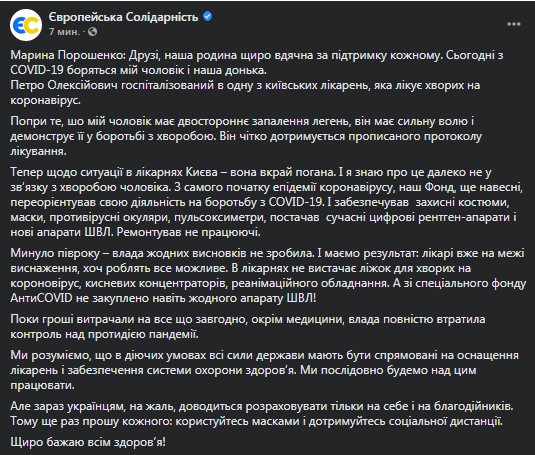 Лидер "Европейской солидарности" Петр Порошенко уже больше недели болеет коронавирусом.