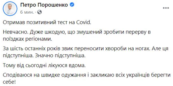 29 сентября Петр Порошенко сообщил, что заразился коронавирусом и теперь лечится дома.