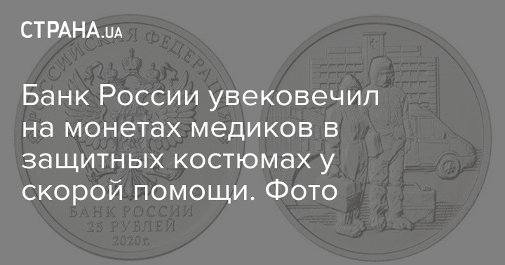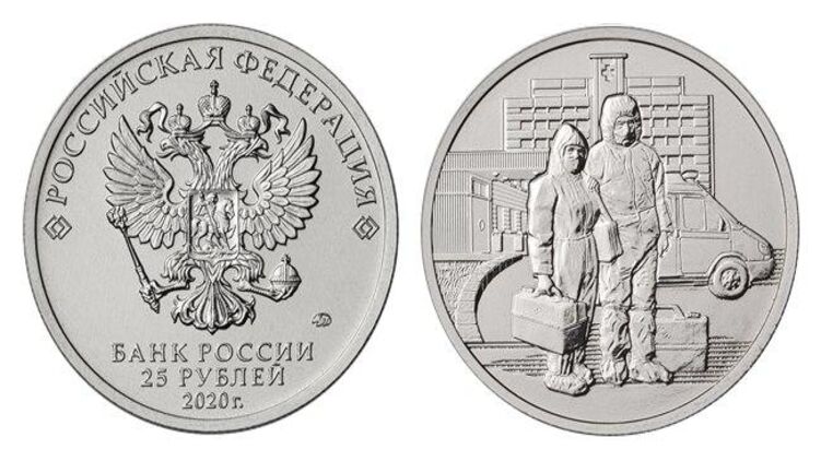 Уточняется, что монета изготовлена из недрагоценных металлов. Медикам посвящена монета номиналом в 25 рублей под названием "Памятная монета, посвященная самоотверженному труду медицинских работников". На ней изображены два медика в защитных костюмах на фоне медицинского учреждения и кареты скорой помощи. Тираж монеты - 5 миллионов.