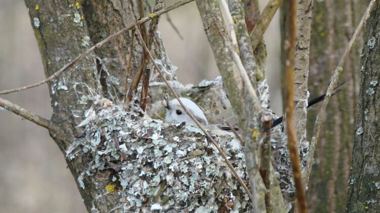 Сотрудники Чернобыльского заповедника показали свежее фото длиннохвостой синицы на ветке и в гнезде.