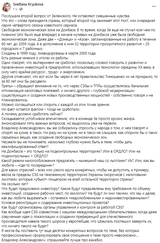 "Второй вопрос Зеленского – о создании свободной экономической зоны на Донбассе, такая же предвыборная технология, как и первый – про пожизненное за коррупцию.