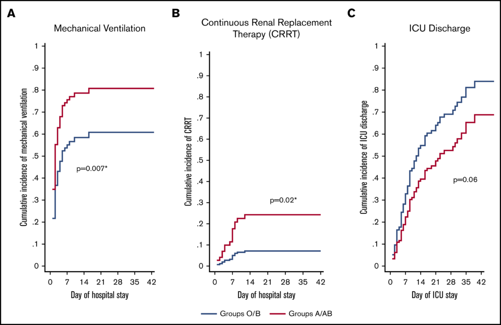 Сравнение двух групп пациентов — с кровью групп 0/B (синий график) и кровью групп A/AB (красный график) (A) Пациенты, которым понадобилась вентиляция легких; (B) Пациенты, которым понадобился диализ; (C) Пациенты, выписанные из отделения интенсивной терапии на определенный день пребывания