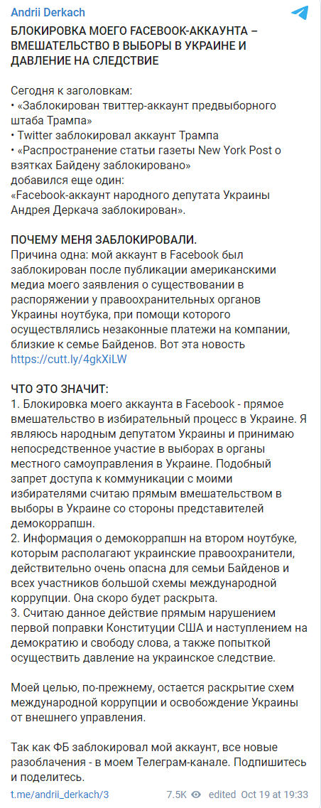 Причина одна: мой аккаунт в Facebook был заблокирован после публикации американскими медиа моего заявления о существовании в распоряжении у правоохранительных органов Украины ноутбука, при помощи которого осуществлялись незаконные платежи на компании, близкие к семье Байденов. Вот эта новость