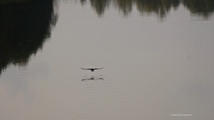 "Баклан над Припятью", - указано в сообщении. На снимке запечатлена громоздкая морская птица, летящая над водоемом на территории заповедника.