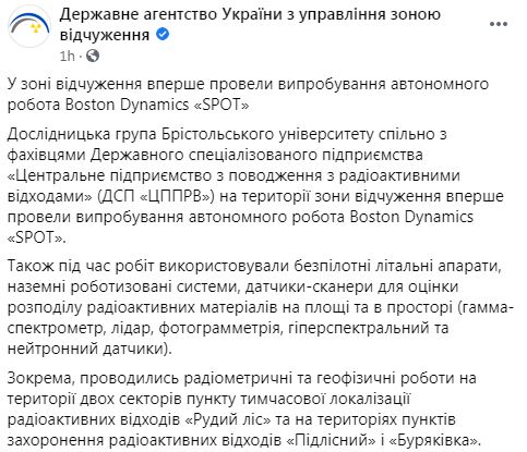 Об этом говорится в сообщении Государственного агентства Украины по управлению зоной отчуждения в соцсети Facebook.