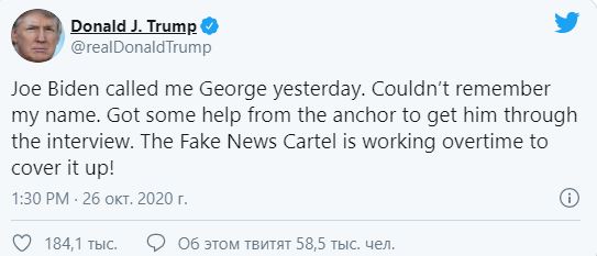 "Джо Байден вчера называл меня Джорджем. Не смог вспомнить мое имя. Ему понадобилась помощь ведущего, чтобы продолжить интервью. Картель фейковых новостей работает сверхурочно, чтобы скрыть это!" - написал президент США.