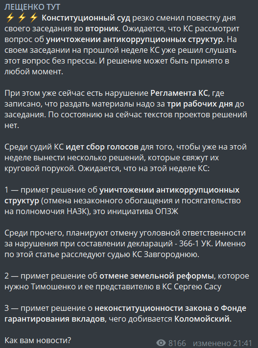 Вчера вечером (еще до появление информации о решении ОАСК) пост написал экс-нардеп Сергей Лещенко. По его информации, параллельно тому, что происходит с ОАСК и Сытником, идут интересные процессы в Конституционном суде.