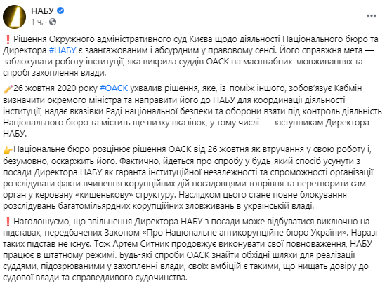 Днем вторника последовала реакция собственно НАБУ. Решение ОАСК там назвали "ангажированным и абсурдным в правовом смысле. Его настоящая цель - заблокировать работу учреждения, которая разоблачила судей ОАСК на масштабных злоупотреблениях и попытке захвата власти".