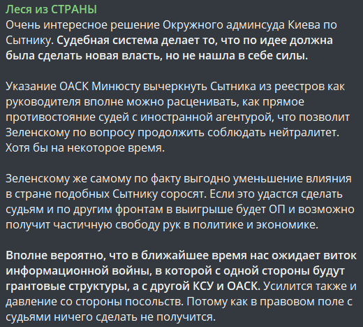 Указание ОАСК Минюсту вычеркнуть Сытника из реестров как руководителя вполне можно расценивать как прямое противостояние судей с иностранной агентурой, что позволит Зеленскому по вопросу продолжить соблюдать нейтралитет. Хотя бы на некоторое время.