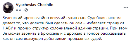"Зеленский чрезвычайно везучий сукин сын. Судебная система делает то, что должен был сделать он сам – избавляет страну от НАБУ и прочих структур колониальной администрации. При этом Зе может звонить в Брюссель и с дрожью в голосе рассказывать, как он сам возмущен действиями продажных судей", - комментирует вердикт ОАСК журналист Вячеслав Чечило.