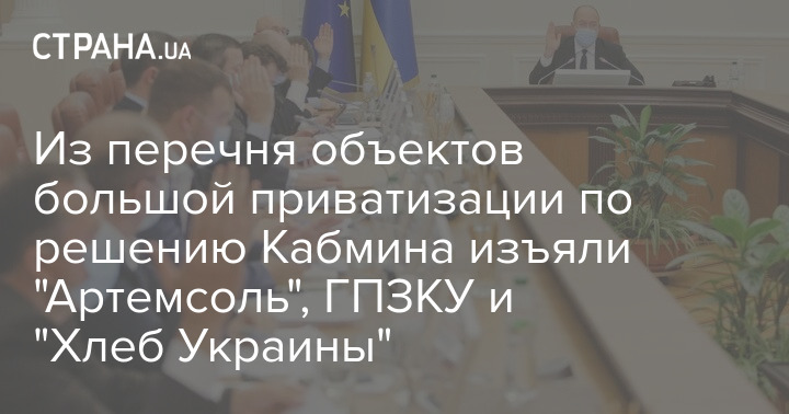 Кабинет министров Украины вывел из перечня объектов большой приватизации государственной собственности госпредприятие "Артемсоль", АО "Государственная продовольственно-зерновая корпорация Украины" и ГАК "Хлеб Украины".