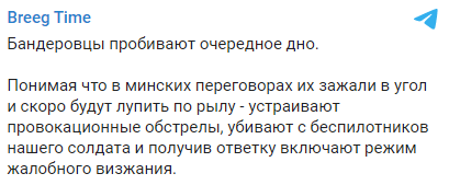 "Устраивают провокационные обстрелы, убивают с беспилотников нашего солдата и, получив ответку, включают режим жалобного визжания", - написал в Телеграме "депутат Народного совета ДНР" Владислав Бердичевский.
