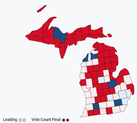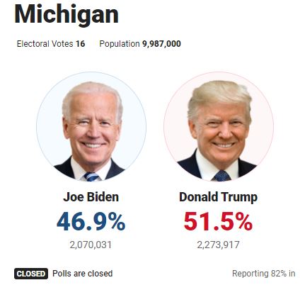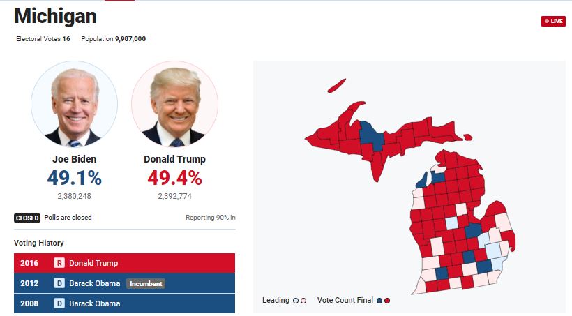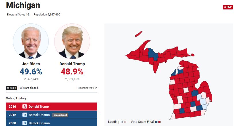 В Мичигане по результатам подсчета 98% бюллетеней Трамп отстает от Байдена на 0,7%.