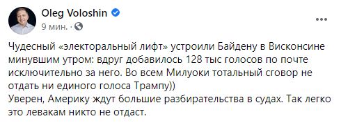 19:05 "Чудесный "электоральный лифт» устроили Байдену в Висконсине минувшим утром: вдруг добавилось 128 тысяч голосов по почте исключительно за него. Во всем Милуоки тотальный сговор не отдать ни единого голоса Трампу)) Уверен, Америку ждут большие разбирательства в судах. Так легко это левакам никто не отдаст" - пишет депутат Олег Волошин.