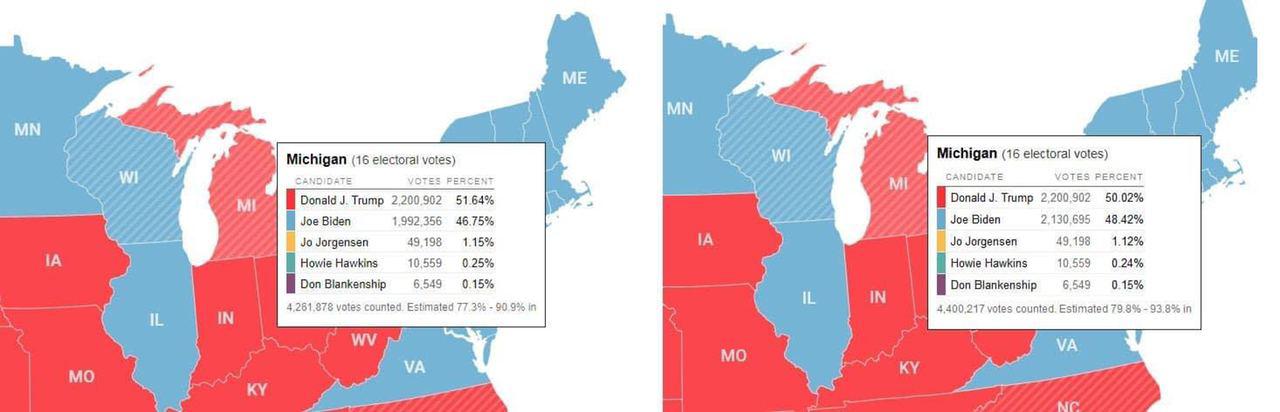 20:12 И ещё чудеса в Мичигане, где вдруг вырвался вперёд Байден. Резко за него проголосовало в конкретный промежуток времени 138 тысяч человек. И ни одного голоса в это время за Трампа. Естественно, при нормальном развитии событий это невозможно.