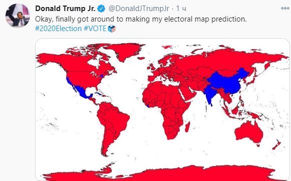 17:30 Сын Трампа обнародовал свой прогноз, согласно которому абсолютное большинство стран поддержат Дональда Трампа.
