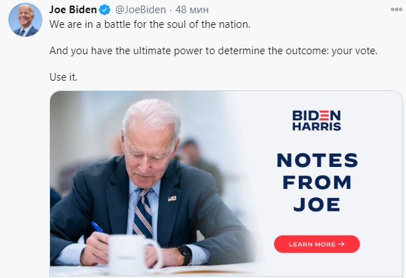 19:30  Предвыборный ролик Байдена, который зовет к походу на участок. Рассчитано на молодую аудиторию. И не скажешь, что самому кандидату уже 78 лет.