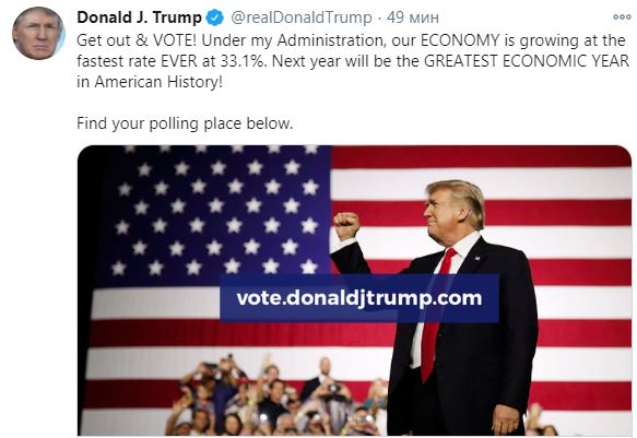 20:25 Трамп в своем Твиттере публикует ролик за роликом, где американцам объясняют, почему нужно голосовать за Трампа, который ставит Америку на первое место, а не за "сумасшедших демократов".