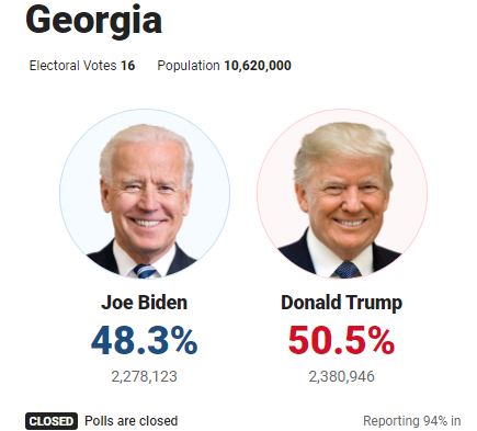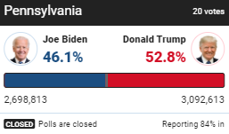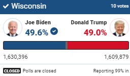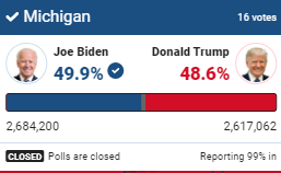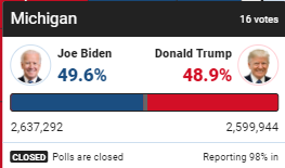 Здесь подсчитано 95% голосов и Байден опережает Трампа на 0,6%. Тоже очень хрупкое преимущество.