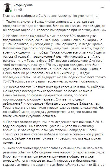 23:02  Байден заявил, что ему хватает штатов, чтобы получить 270 голосов выборщиков. Но он еще не заявляет о победе на выборах.