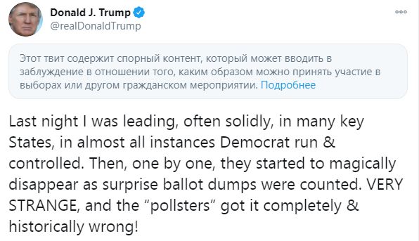 17:52 "Прошлым вечером я лидировал, часто основательно, во многих ключевых штатах, почти во всех случаях подконтрольных демократам. И вот один за одним они начали магически пропадать, как только учитывались неожиданные вбросы бюллетеней. Очень странно, и "опросы общественного мнения" были абсолютно и исторически неверны!",— написал Дональд Трамп в Twitter.