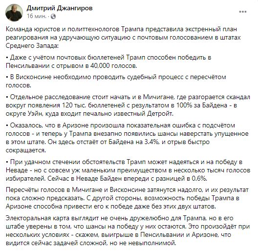 19:17 "Команда юристов и политтехнологов Трампа представила экстренный план реагирования на удручающую ситуацию с почтовым голосованием в штатах Среднего Запада: