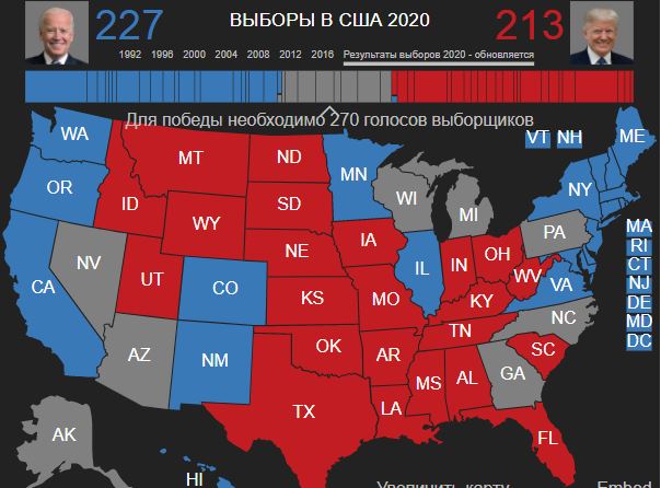 Байден набирает 264 голоса выборщиков из 270 необходимых. У Трампа 214 голосов.