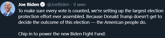 Подключайтесь к новому Фонду борьбе Байдена", - написал кандидат в Твиттере.