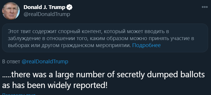 00:55  Президент США говорит о массовых вбросах бюллетеней. Твиттер помечает это как "спорный контент".