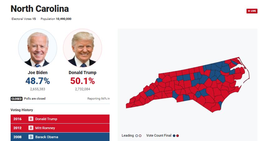 В Северной Каролине (15 выборщиков) после подсчета 94% голосов лидирует Трамп с 50,1%, у Байдена - 48,7%.