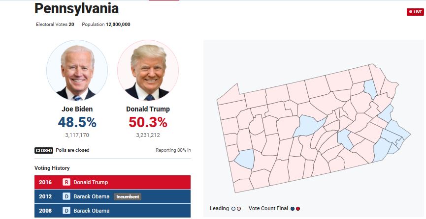 Там обработано 89% голосов. Лидирует Трамп с 50,7%, у Байдена - 48,1%.