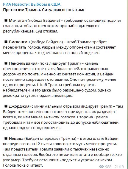 18:52 Итоги президентской гонки по-прежнему не определены. Не завершен подсчет в целом ряде штатов: Пенсильвании, Неваде, Северной Каролине и Джорджии.