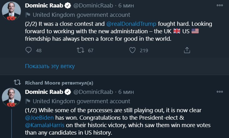 "После завершения кампании пора оставить гнев и резкую риторику позади и объединиться. Пора всей Америке объединиться. И устранить противоречия", - ответил на поздравления Байден.
