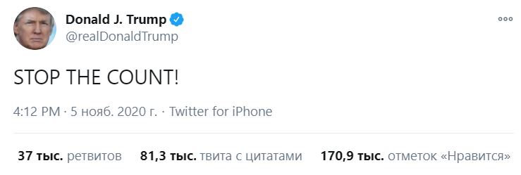 Действующий президент США и кандидат на следующий срок Дональд Трамп призвал остановить пересчет голосов на выборах. Об этом он написал в своем микроблоге в Twitter.