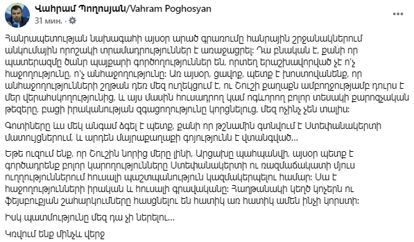 "К сожалению, сейчас мы вынуждены признать, что череда неудач все еще преследует нас, и город Шуши полностью вне нашего контроля", - говорится в его сообщении.