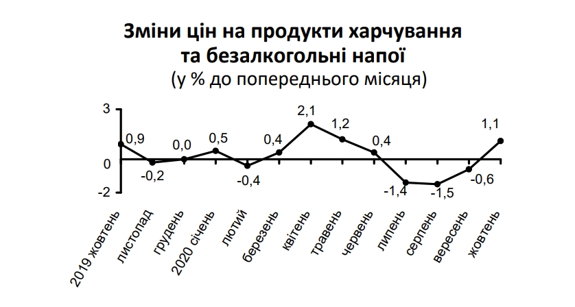 Так, потребительская инфляция в Украине в октябре 2020 года в годовом выражении, по сравнению с сентябрем 2019 года, составила 2,7%, ускорившись с 2,3%, зафиксированных в сентябре. В месячном исчислении цены в октябре выросли на 1%.