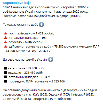 По состоянию на утро среды, 11 ноября, в Украине подтвердились 10 611 новых случаев заражения коронавирусом. И это почти повторение предыдущего печального антирекорда, который был отмечен 7 ноября, когда за сутки в стране было выявлено 10 746 зараженных.