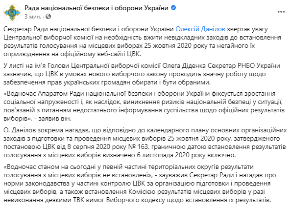 Секретарь Совета национальной безопасности и обороны (СНБО) Украины Алексей Данилов заявил о требовании принять безотлагательные меры к установлению результатов голосования на местных выборах 25 октября 2020 и немедленного их обнародования на официальном веб-сайте ЦИК.