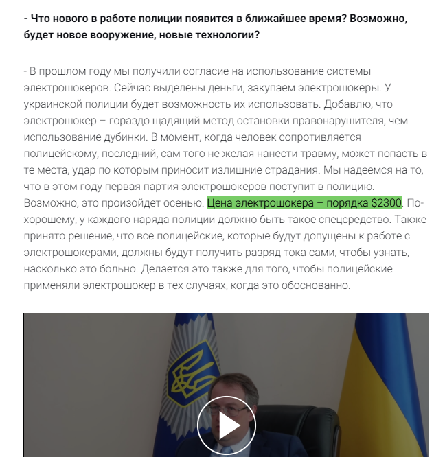 О том, что полиция начинает закупать электоршокеры, еще в мае говорил замминистра Антон Геращенко. По его словам, стоимость одного экземпляра - 2300 долларов. В МВД исходят из того, что шокером должен быть оснащен каждый наряд полиции.