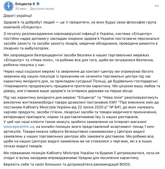 После введения карантина выходного дня, сети торговых центров "Эпицентр" сделали заявление о режиме своей работы.